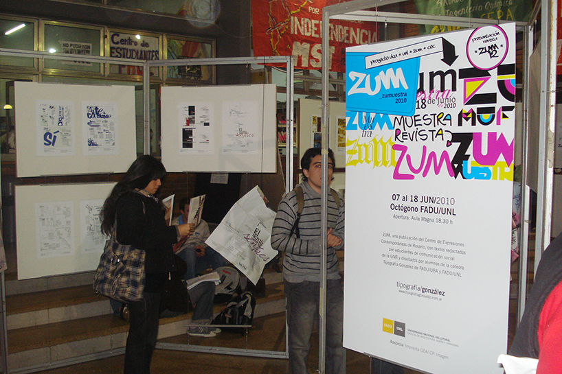 ZUM es una publicación del Centro de Expresiones Contemporáneas de Rosario que surge como un proyecto de interacción entre estudiantes de diseño, periodismo y comunicación. En el ciclo lectivo 2009 los estudiantes de Tipografía 2 de la Cátedra González en UBA y UNL participaron del proyecto diseñando las propuestas para las ediciones #12 Valor, consumo y arte; #13 El cuerpo y #14 Sentidos olvidados.