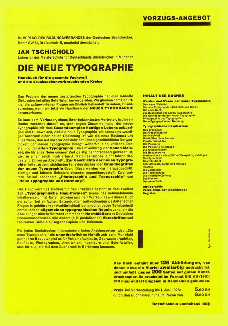 Este artículo, que enumera los principios del nuevo enfoque de la tipografía en los años 20, constituye un importante antecedente de su libro «Die Neue Typographie», que publicará tres años más tarde.