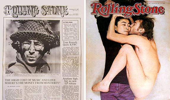 Primera edición de la revista Rolling Stone (9 de noviembre de 1967) con su logotipo original diseñado por Rick Graffin. A su derecha, la edición nº 335 (22 de enero de 1981) donde aparece la versión definitiva del rediseño del logotipo, a cargo de Jim Parkinson.