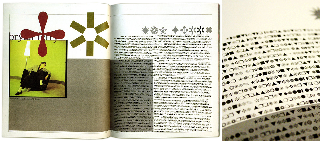 En la edición nº13 de la revista Raygun, David Carson da un paso más en la transgresión de la ortodoxia racional del diseño gráfico y diseña una entrevista al músico Bryan Ferry utilizando enteramente la tipografía Zapf Dingbats.