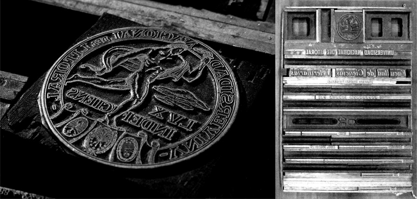 IZQUIERDA: Cuño seco del efebo de la UNL, utilizado en los títulos de grado. 80 mm de diámetro (foto: ©Anichini)