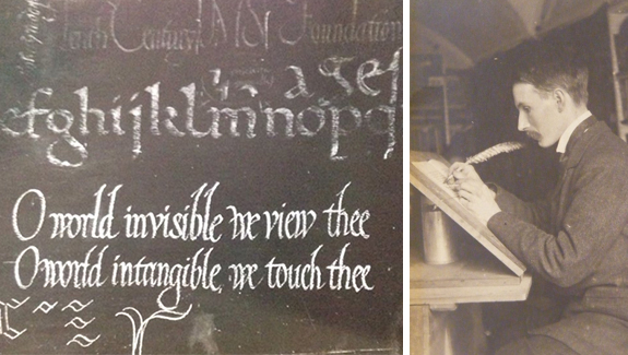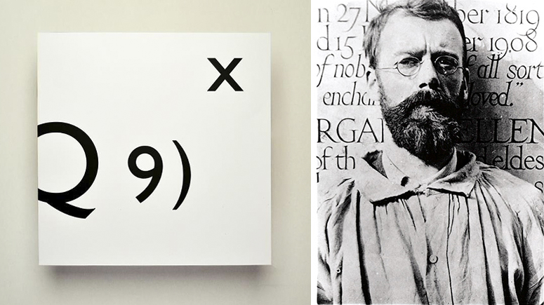 Izquierda: composición en Gill Sans, de la estudiante Florencia Zaccara (tp La tipografía y su dimensión sintáctica, T1 UBA 2015). Derecha: retrato de Eric Gill, por Robert Gibbings en 1908.