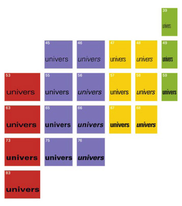 Esquema del primer gran sistema de variables: la tipografía Univers (1957), del suizo Adrian Frutiger. La variable normal es la 55. Los números responden a un código en el que la decena se corresponde con el tono (a mayor número, más peso) y la unidad con la proporción (a mayor número, más condensación). A su vez, si el número es par, la tipografía es oblicua.