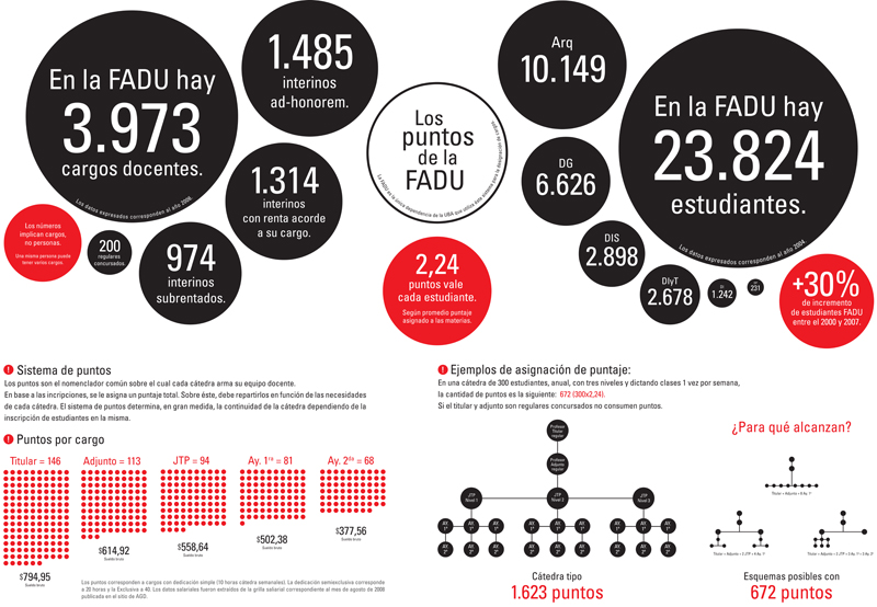 Así es como cuatro docentes de Tipografía/González —María Eugenia Vigna, Valeria Nussembaum, Diego Schtutman y Sergio Braguinsky Carrera— diseñaron y materializaron un panel informativo en el cual se intenta explicar el para muchos perverso sistema de puntos del cual dependen los titulares de cátedra para armar sus planteles docentes.