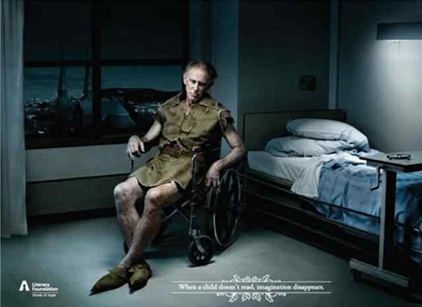 La campaña de la Literacy Foundation de Canadá (2009) es un tanto impactante, ya que nos muestra populares personajes de cuentos infantiles al borde de la muerte en un hospital. El objetivo es concienciar a la población de que la imaginación de los niños que no tienen acceso a los libros desaparece con el tiempo.