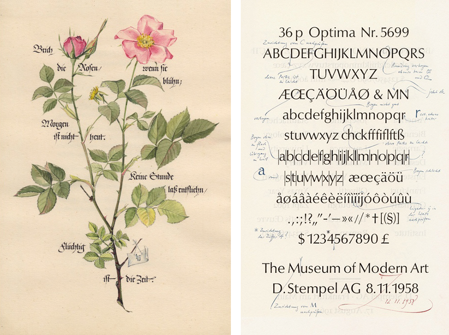 Derecha: Correcciones y comentarios sobre prueba impresa de su diseño de la familia Optima, 1958.